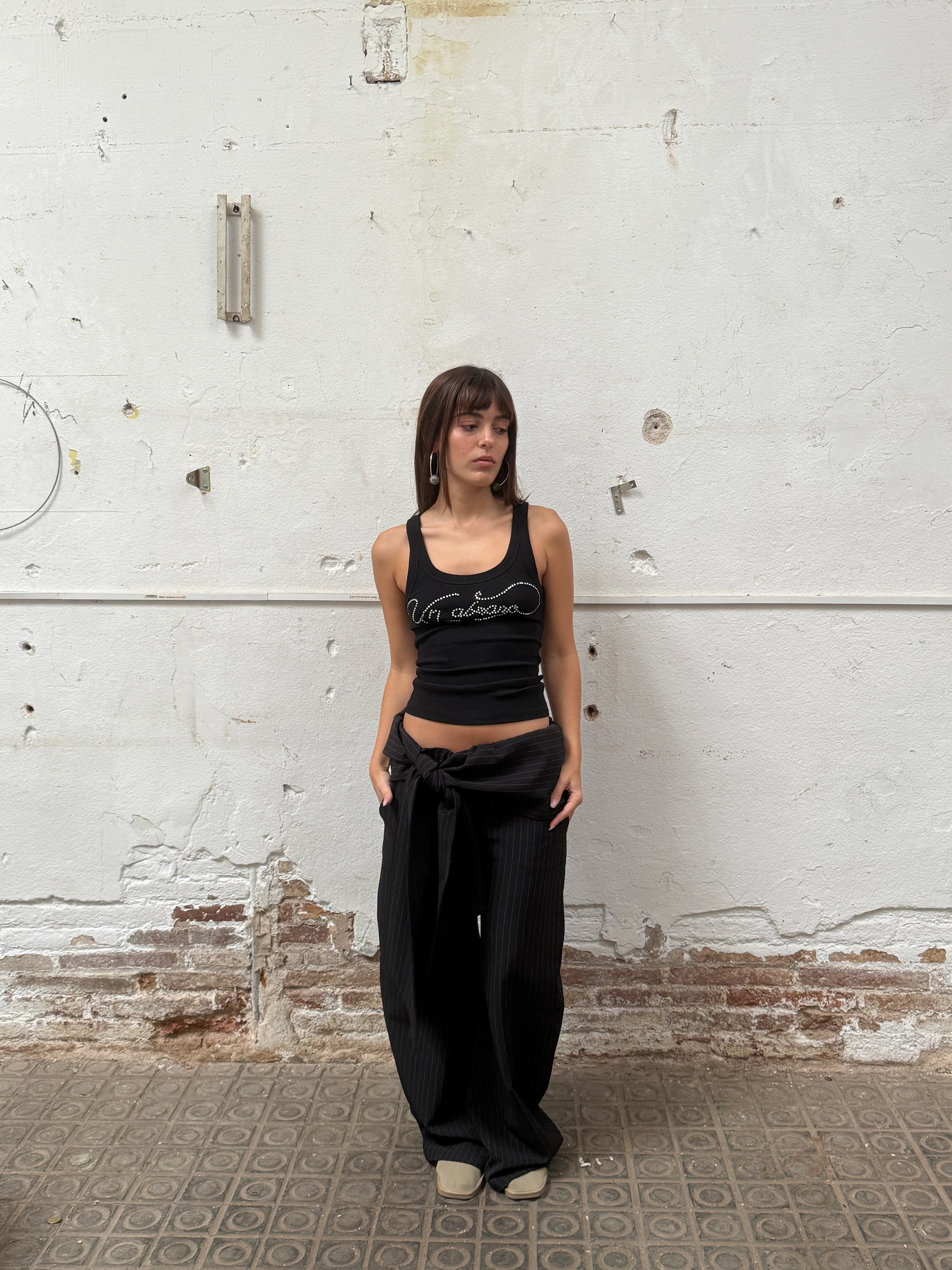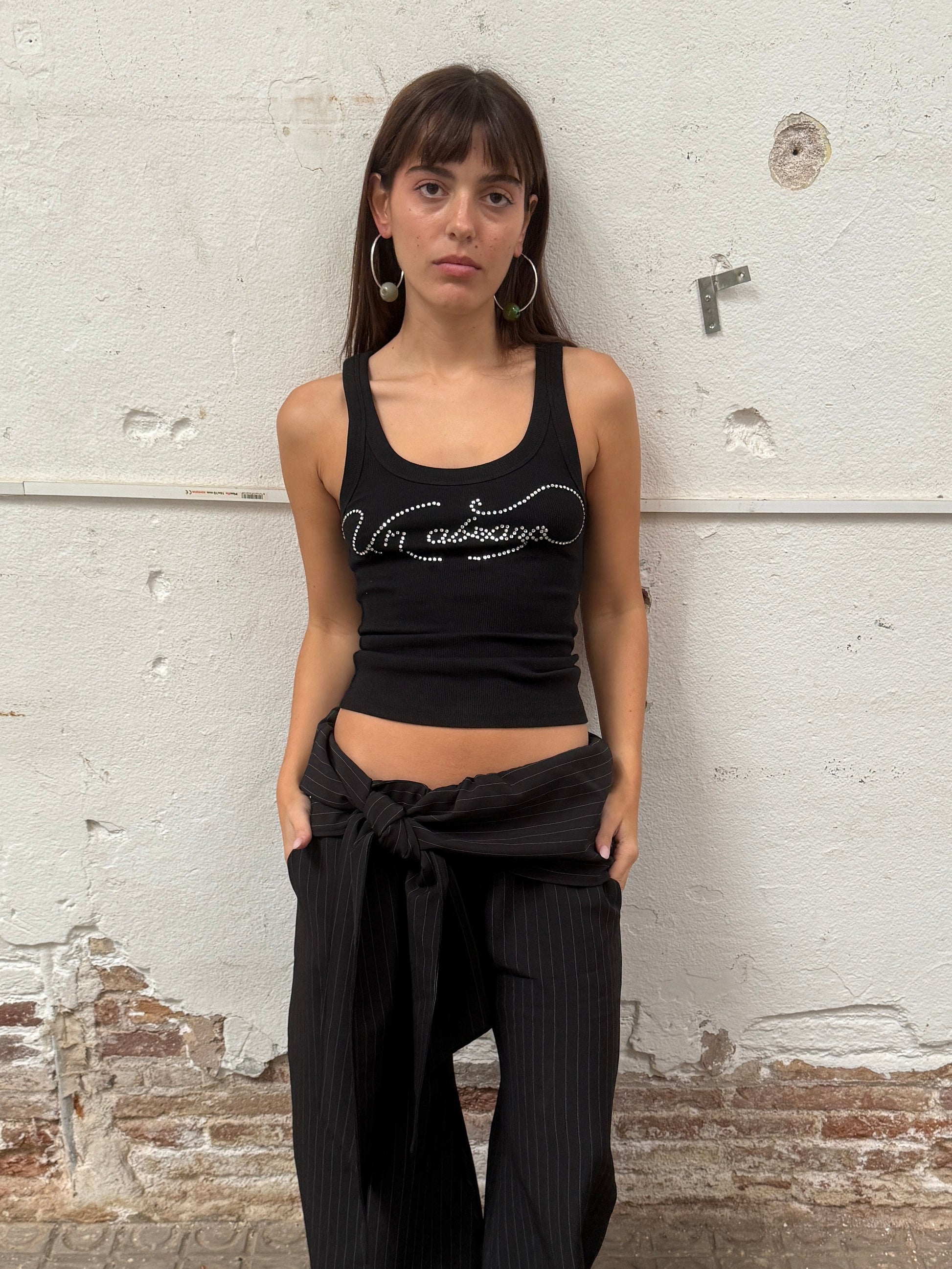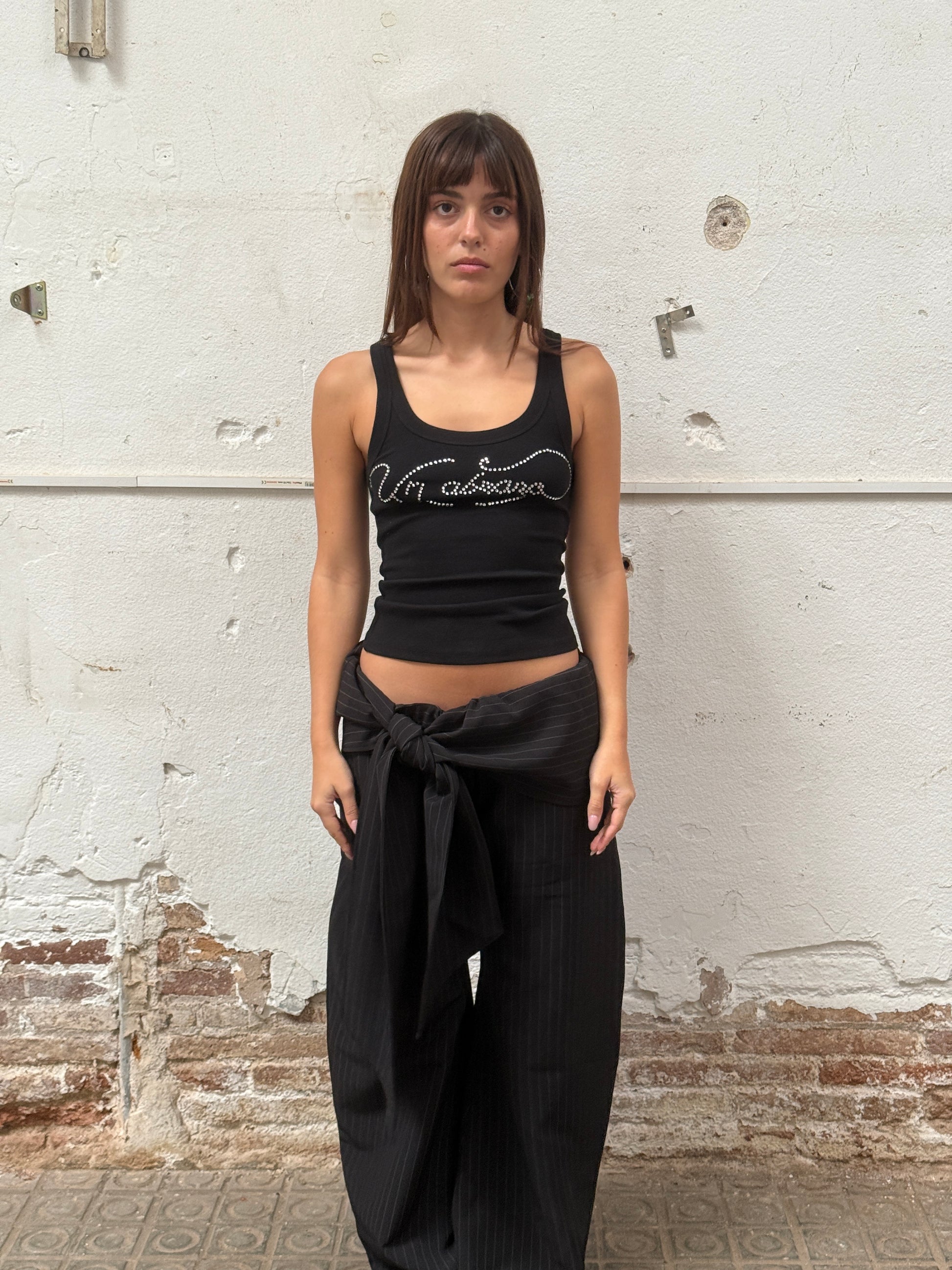 Black rib tank top with strass detail on the chest: "Un Abrazo".