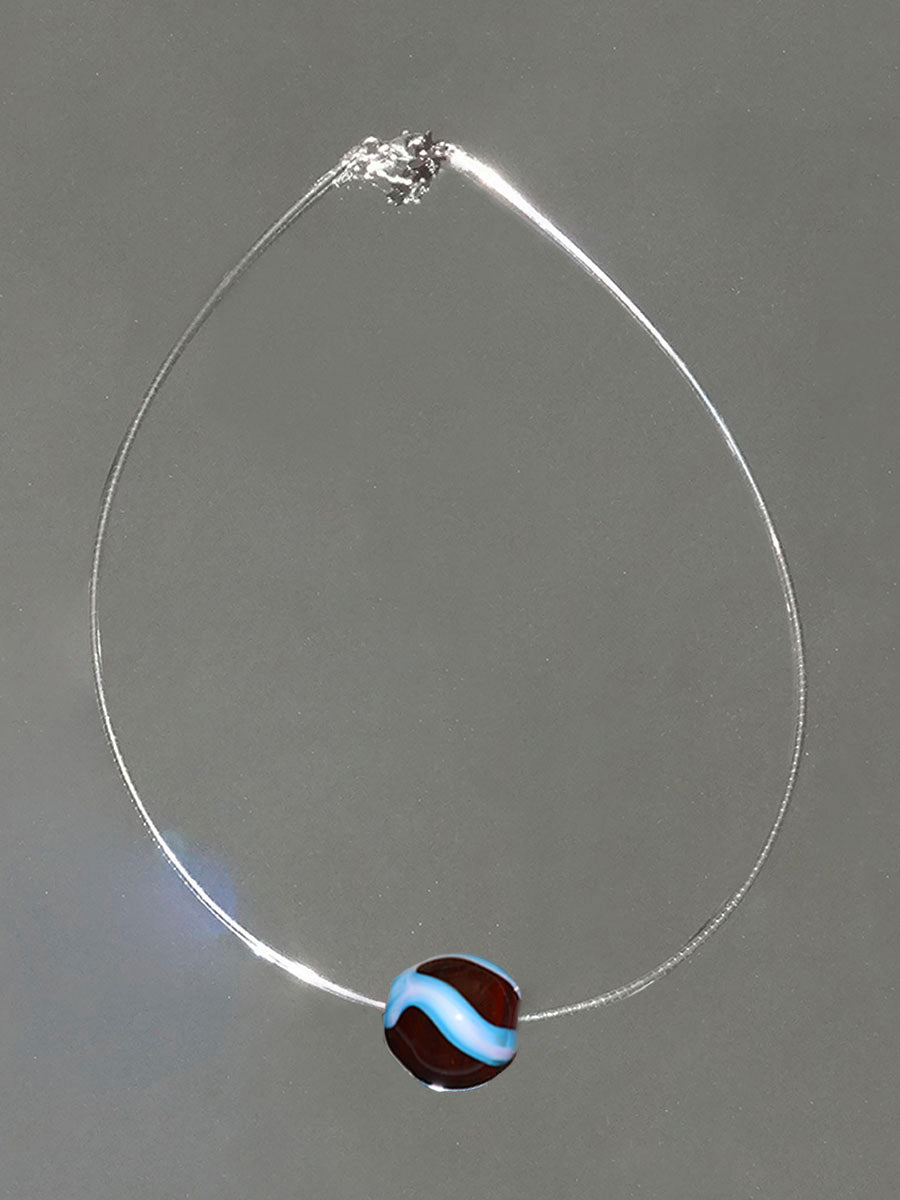 Sterling silver rigid necklace with a striped glass bead. Opaque marbled brown and marbled light blue.