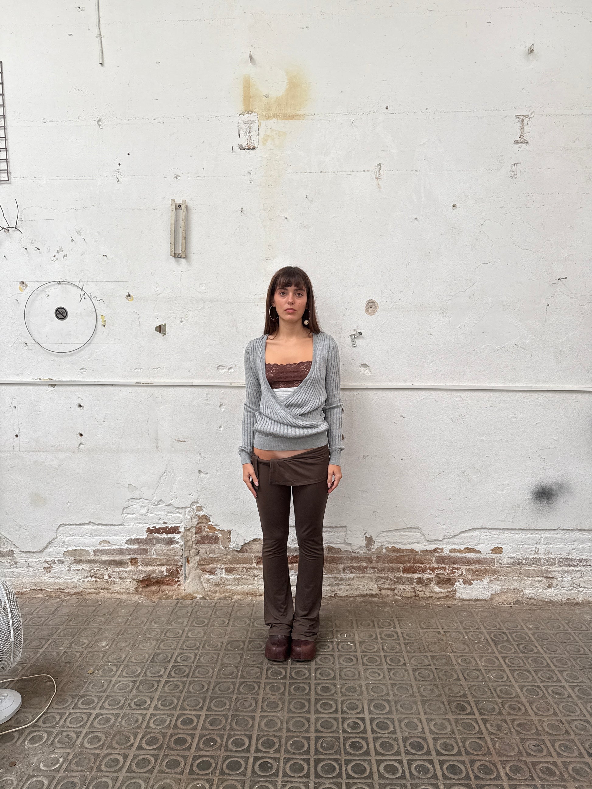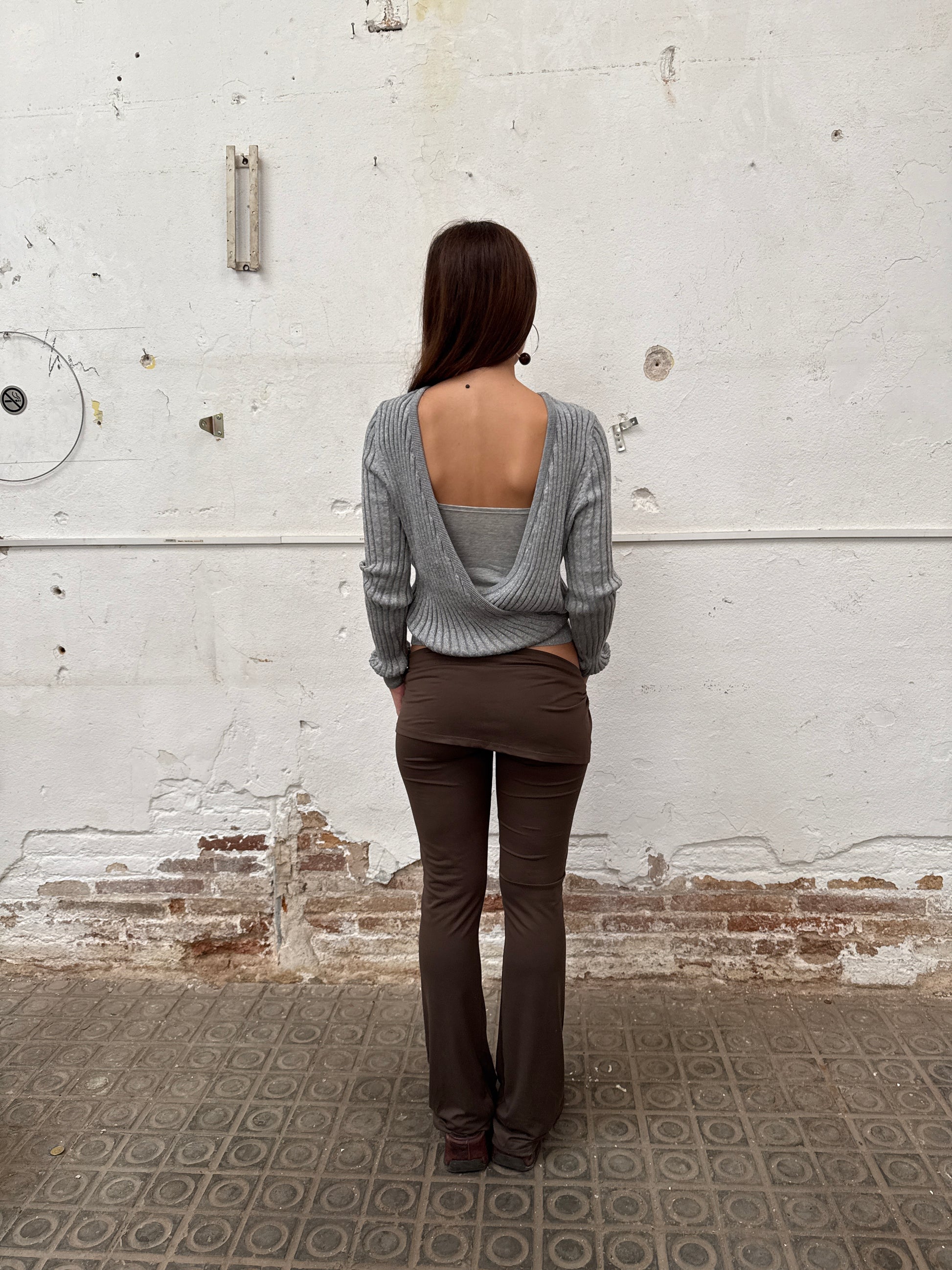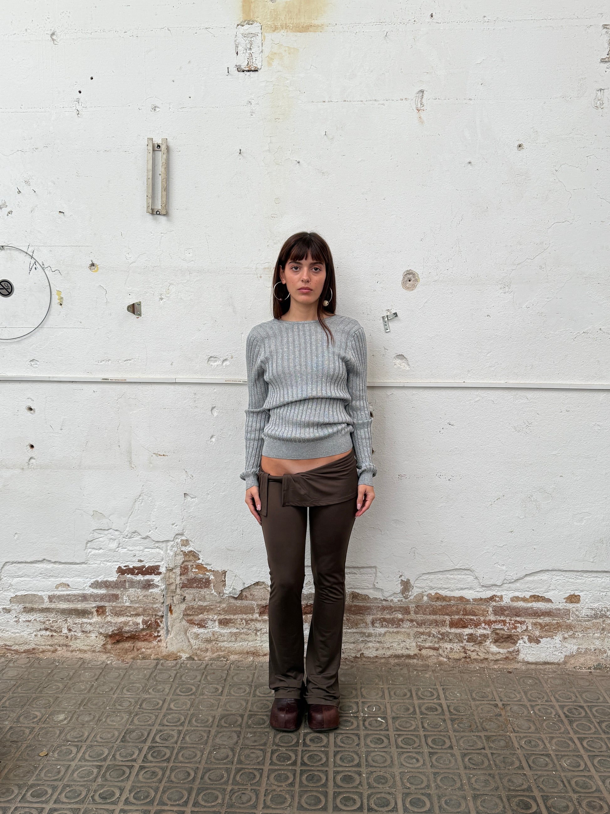 Reversible grey lurex knitted jumper with long sleeves. One side has a wrap deep V neckline and the other one has a closed plain neckline, can be worn front to back.