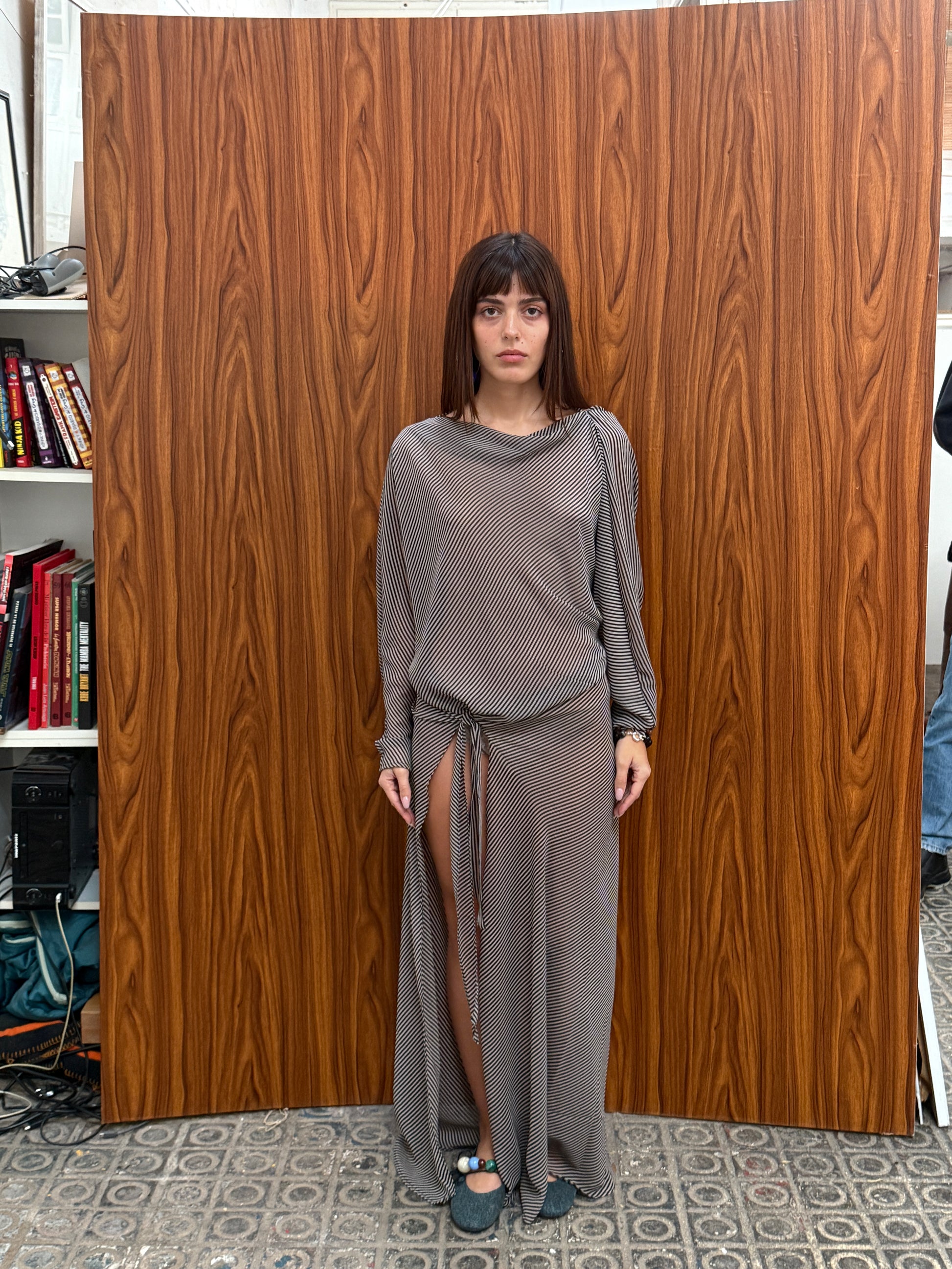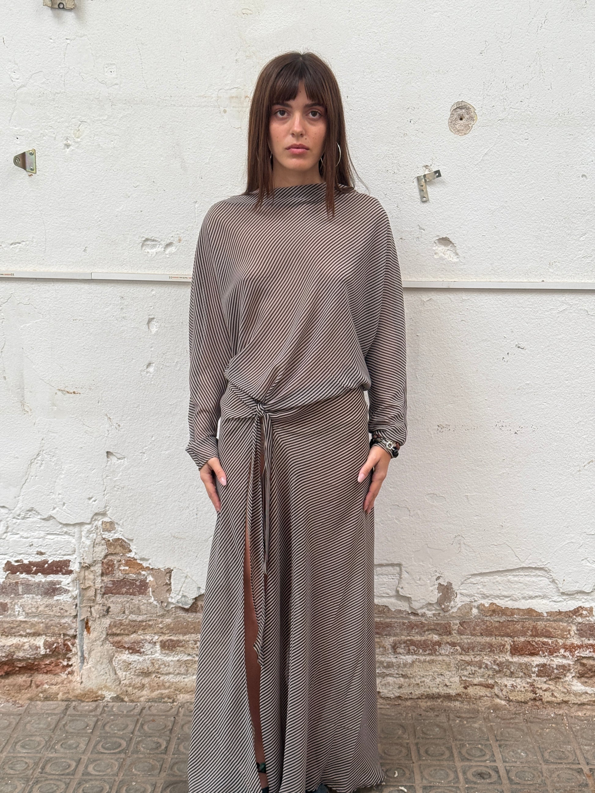 Draped long sleeve dress with knot detail at the waist. Featuring an open back and a front slit.