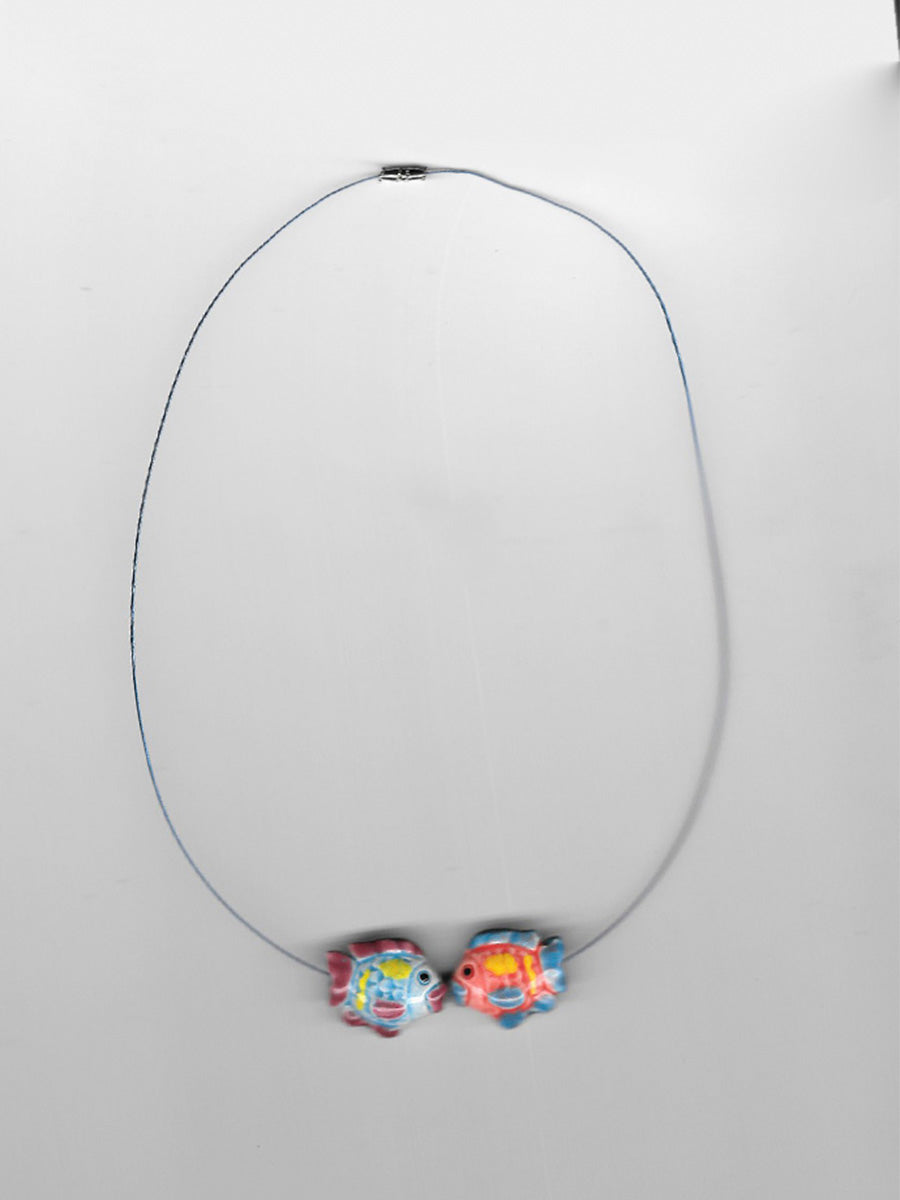 Nylon coated stainless steel necklace with two ceramic fish beads made by hand in Barcelona