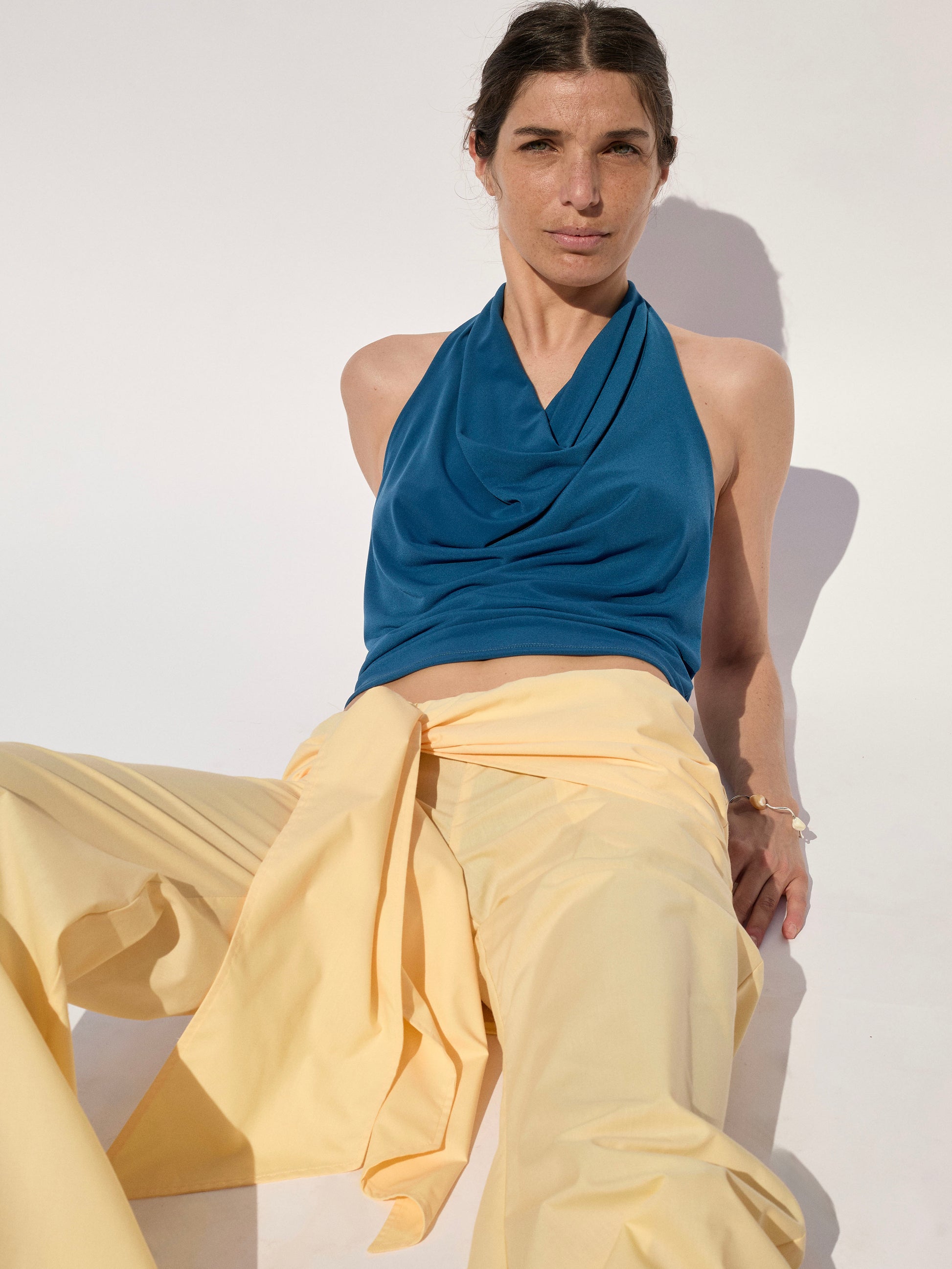 Tailored pants cut in thin yellow cotton with knot detail in the waist. Featuring side pockets and a wide waist as a skirt.