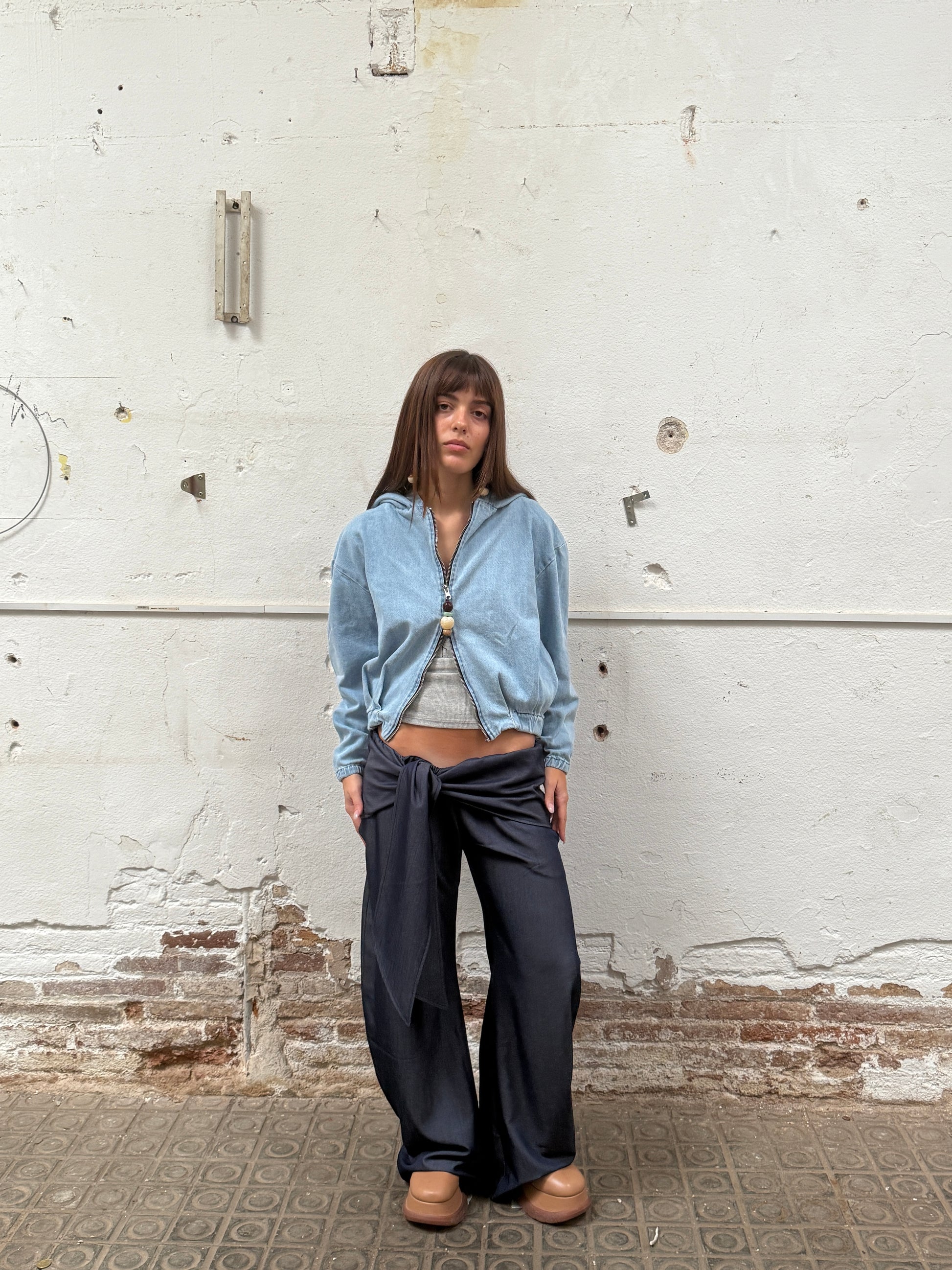 Tailored pants cut in thin denim with knot detail in the waist. Featuring side pockets and a wide waist as a skirt.